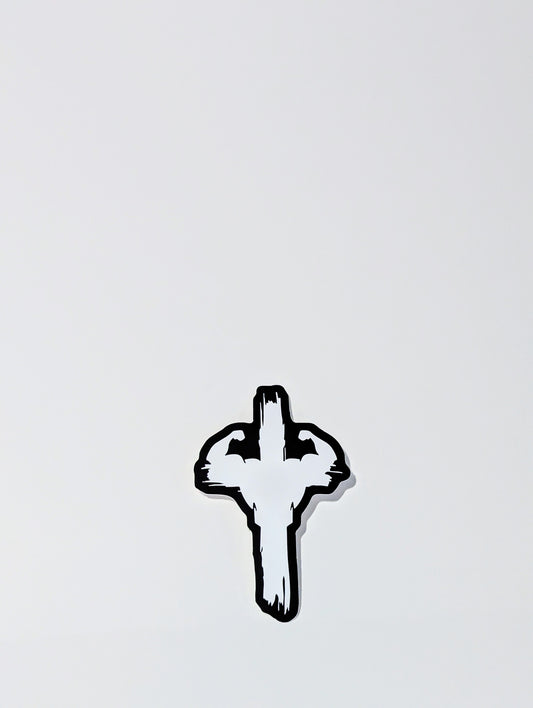 This sticker is so cool! Jesus' cross with muscle arms. I stuck it to the rear window of my car. It withstands all types of weather.